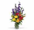 Yellow and lavender flowers, like the sun peeking through morning clouds, are dramatically showcased in this contemporary lavender cube vase. Send it to someone special.