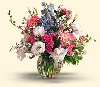 Includes delphinium, gerberas and larkspur in dainty glass vase.