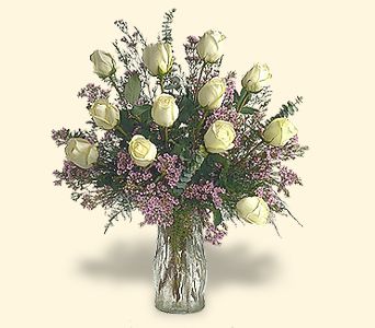 This lovely arrangement contains one dozen roses mixed with eucalyptus and other floral and green accents in a lovely glass vase.