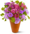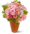 Peach roses, green carnations and white alstroemeria – accented with bupleurum and oregonia – are delivered in a clay pot.