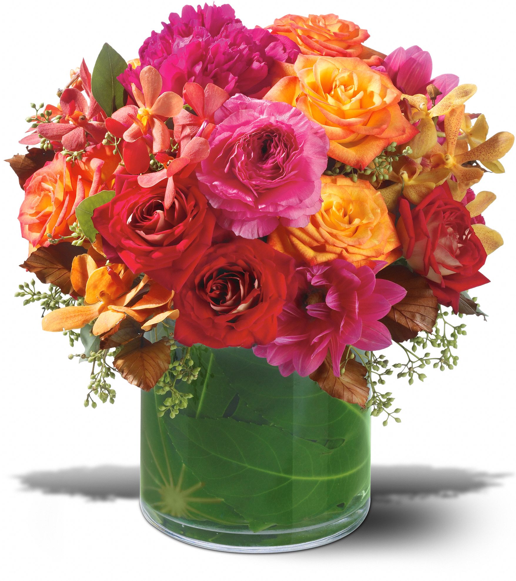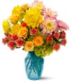 Orange alstroemeria and bi-color dahlias, plus yellow Asiatic lilies, roses and Viking spray chrysanthemums – accented with oregonia – are delivered in a glass cylinder vase.