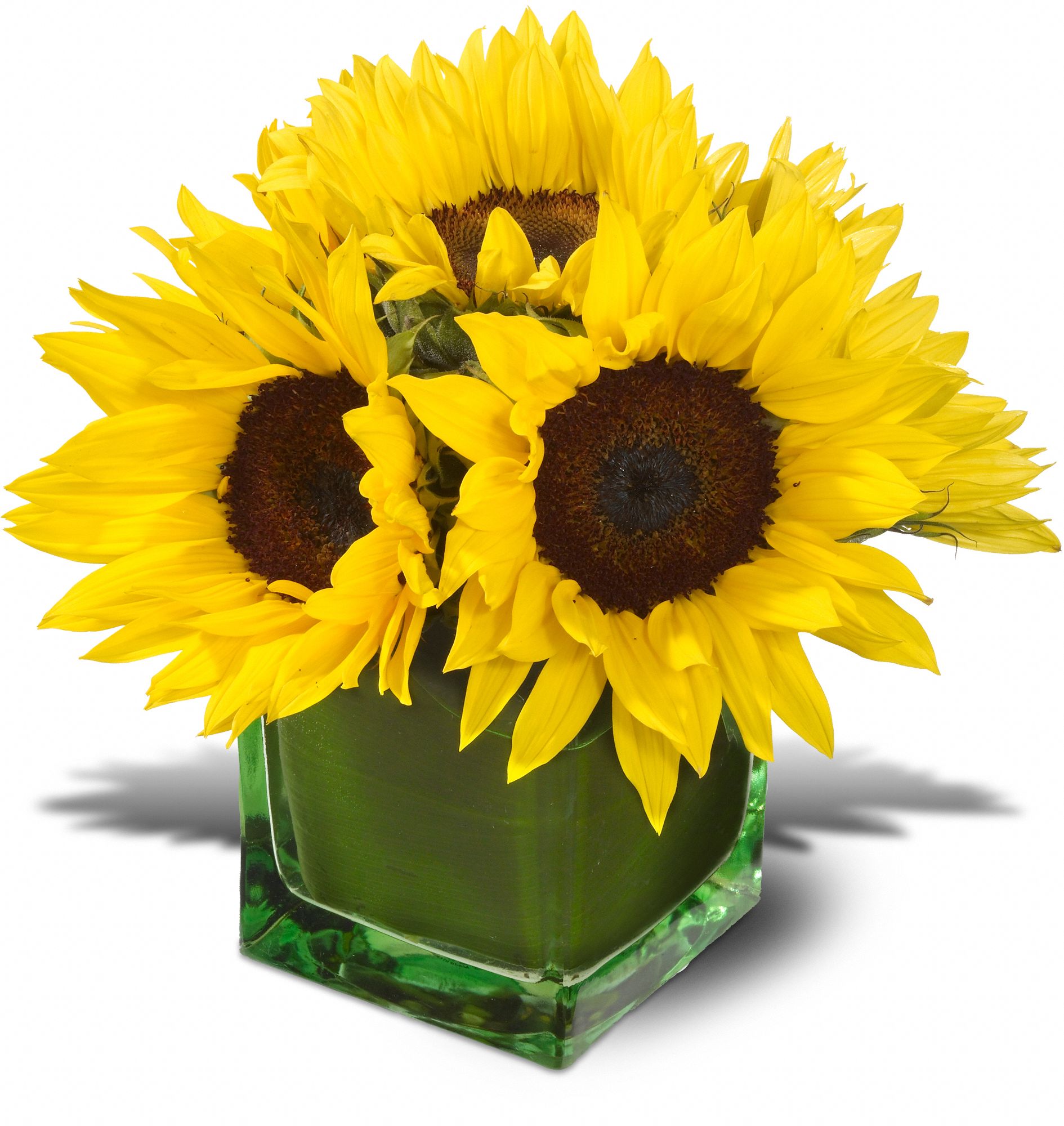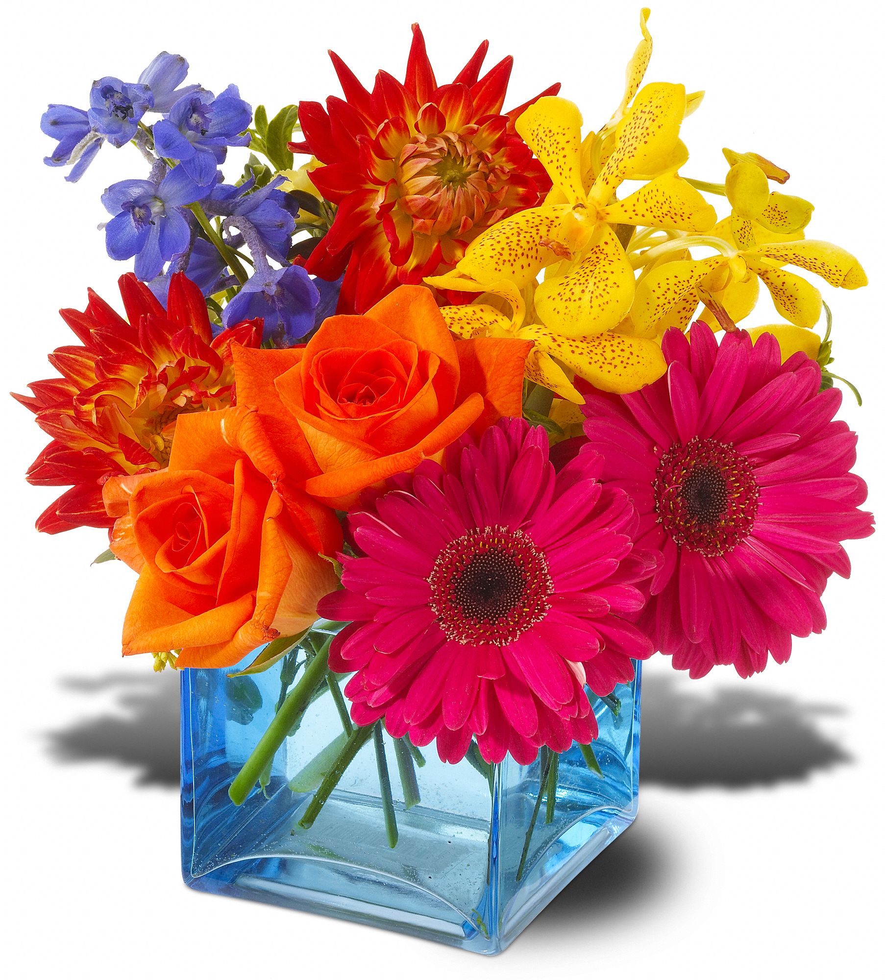 Make a summertime splash with this pop art mix of yellow, hot pink, orange and green blossoms, presented in a modern glass cube vase � and bring warm-weather fun to someone�s day!
