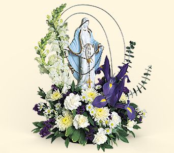 Flowers with a truly inspirational gift -- lovely porcelain keepsake that elegantly portrays the Madonna, subtly enhanced with touches of gold. In her hands, she carries a removable miniature rosary.