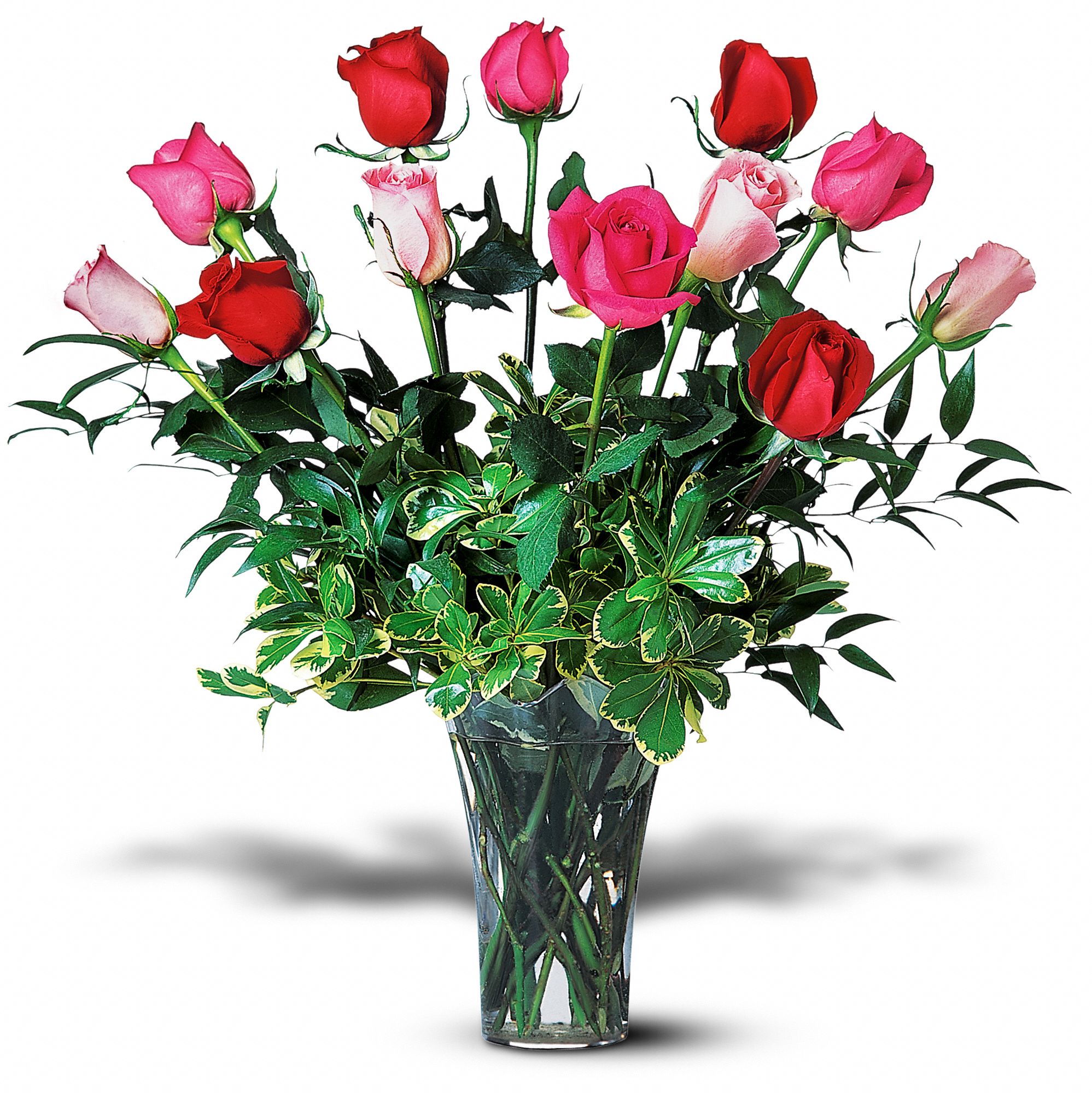 Three yellow, three red, three white and three light pink roses, accented with variegated pittosporum, arrive in a tapered glass vase.