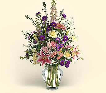 Includes lilies, carnations and alstroemeria in a charming glass vase.