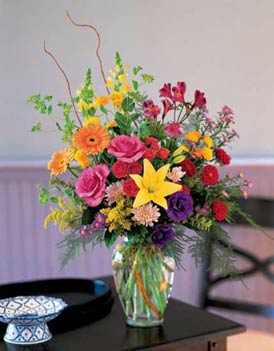 Alstroemeria, chrysanthemums, roses, gerberas and snapdragons are delivered in a stylish glass vase.