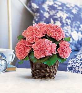 Soft pink carnations, collared by leaves, arrive in a petite wicker basket.