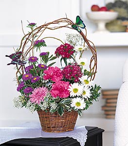 Asters, carnations, Sweet William and daisies arrive in a basket with colorful butterflies and curly willow.