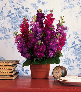 Fragrant stock stems in a variety of colors are delivered in a charming terra-cotta pot.