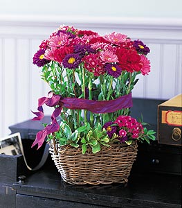 Asters, carnations, chrysanthemums and Sweet William stand proudly in a wicker basket.