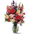 Asters, daisies, larkspur, stock and roses arrive in a simple round bowl.